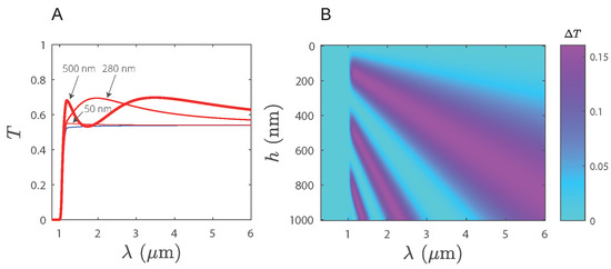 The same type of calculation was performed for transmittance T on double-sided polished silicon substrates in the range of mid-IR, see Figure 11. In part A, a few examples of T against are given for three different coating thicknesses (30, 280, and 500 nm, red curves) and are compared to the transmittance of the bare substrate in blue. Obviously, the silicon substrate is opaque () below some which actually depends on its thickness, here m for a 325 m thick substrate. Above this opacity cut-off, the substrate is basically homogeneously semi-opaque (e.g., at 4 m) while adding a thin coating can dramatically enhance the transmittance. Part B of Figure 11 shows a mapping of the increase of transmittance that the coating provides, namely , against h and . In the mid-IR range, up to 15% of transmittance enhancement can be observed; obviously, this enhancement depends significantly on but can nevertheless be of some interest for monochromatic processes such as imaging.