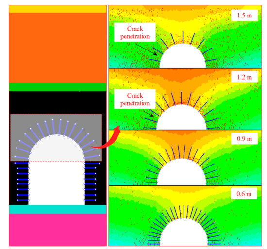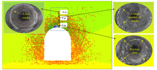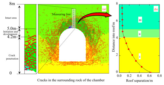 - After excavation, the chamber dome suffers from shear failure, and forming a large number of cracks. In the crack penetration area, the bearing capacity of the chamber dome is significantly reduced and the roof separation is sharply increased. In the crack penetration area, when the crack is connected with the chamber surface, under the effect of the ground pressure, the coal body is separated from the chamber dome and roof fall hazard occurs.