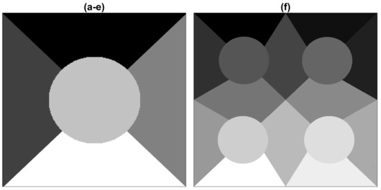 Six composite texture images were segmented in this work (Figure 1). The first five composites are images of pixels and consist of five different textures whilst the last one is pixels and is formed with 16 different textures. The masks with which these were formed are shown in Figure 2. It should be highlighted that these textures have been histogram equalised prior to the arrangement and thus they cannot be distinguished by the general intensity of each region. It is frequent that comparisons are made over textures that are not equalised (e.g., [57] Figure 3, [45] Figure 2) and thus the segmentation is not only based on the texture but the average intensity of the regions. Furthermore, whilst some textures are easy to distinguish, there are some that are quite challenging, for instance, the difference between the central and bottom regions in Figure 1c or the top left corners of Figure 1d,e.