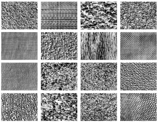 - Brodatz, P. Textures: A Photographic Album for Artists and Designers; Dover: New York, NY, USA, 1996. [Google Scholar]