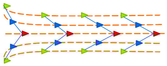 A sample formation is shown in Figure 1. As can be seen, one leader (red) and four followers (blue and green) arranged in a particular formation to form a triangular motion without conflict to each other and with predetermined moving.