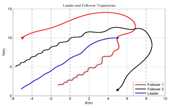 For the first example, consider a formation that consists of one leader and two followers. We apply the adaptive-robust control rule in Equation (32) and to avoid unboundedness in control inputs, a saturation function is applied on the control signals.