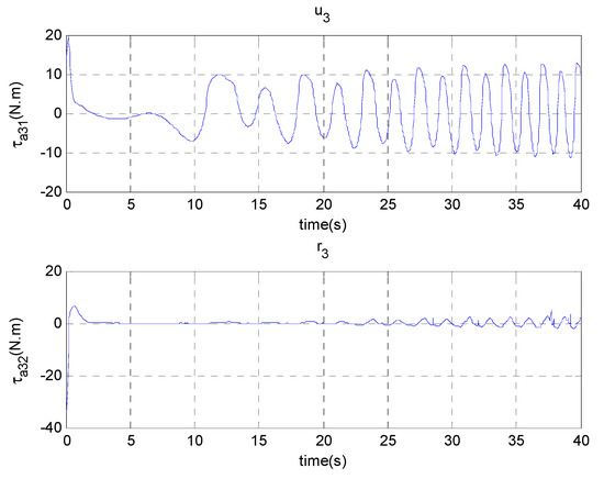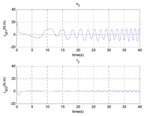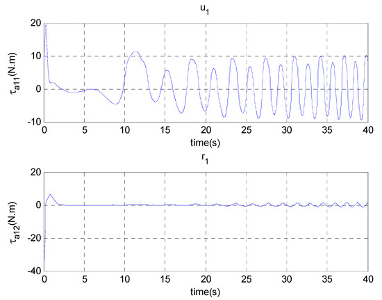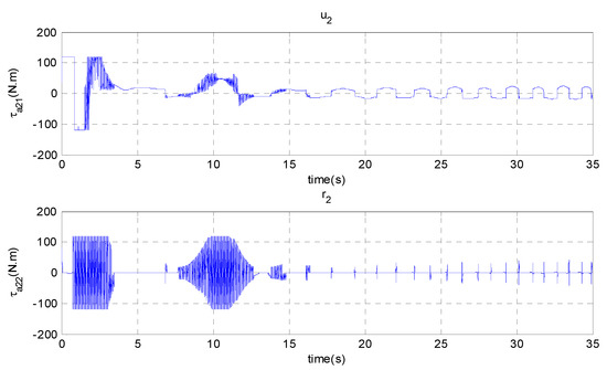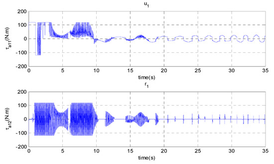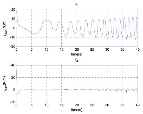 For the second Example, considering four followers and one leader in a formation, the control rule in Equation (44) has been simulated. In this case using a hyperbolic tangent function that is a bounded function, we expect that input controllers remain bounded. In Example 1, due to irregularity and the discontinuity of saturation function, the oscillations in the input torques are severe. However, in the second simulation, due to the hyperbolic tangent function that is smooth and continuous, in addition to the constraint of the control signals, the discontinuities in the input controls intensity decreased.