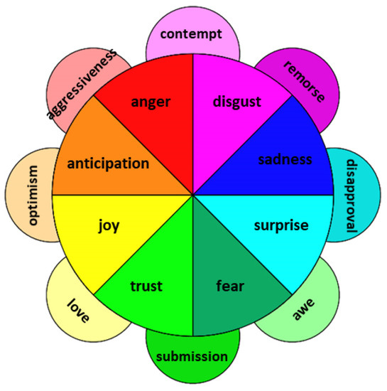 Other scientists have developed the theme of basic emotions. For example, Plutchik [35,36] developed a new model, called the “wheel of emotions”, where basic emotions can be expressed at different intensities and can mix to form several emotions, as shown in Figure 1. Plutchik’s eight basic emotions here called primary are joy, trust, fear, surprise, sadness, anticipation, anger, and disgust. Additional emotions exist, like aggressiveness, optimism, love and submission: these are all seen as a combination of primary emotions.
