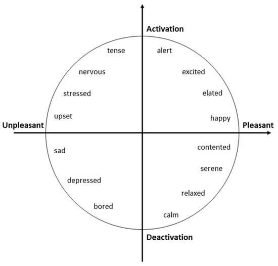 Russell [37,38] developed the Circumplex Model of Affect, presented in Figure 2. It is a circular model divided into quadrants, to show the level of valence and arousal of emotional states. The x-axis represents the continuum between pleasant and unpleasant emotions, the y-axis represents the continuum between high and low arousal emotions, while the center of the circle represents a neutral valence and a medium level of arousal.