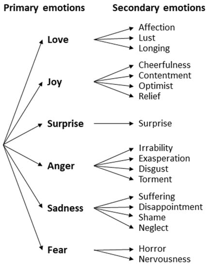 Another theory that has gained notoriety is Parrott’s approach [39], in which he identified over 100 emotions and conceptualized them as a tree-structured list, as seen from Figure 3. The first layer is composed of six primary emotions (love, joy, surprise, anger, sadness, and fear) that can be branched out into different forms of feeling, and the secondary emotions are the derivation of the primary ones instead of being a combination of them. Some of these emotions were not categorized by human expression, but rather, emotional states.