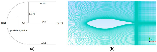 To investigate the aerodynamic sensitivity to particles, an air-particle two-phase flow over the S809 airfoil is simulated at different Re numbers, particle concentrations and angles of attack. In this work, the particle diameter and density are set as 50 μm and 1000 kg/m3, respectively. As sketched in Figure 1a, particles are injected from an upstream plane with a 5c distance from the airfoil. The injection velocity of particle is equal to the wind speed.