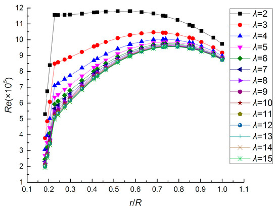 Figure 2 shows the Reynolds (Re) number distributions of the Phase VI blade sections at different tip speed ratios defined as