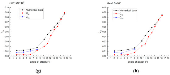 Lift and drag coefficient comparisons for S809 airfoil in one-phase air flow: (a) CL at Re = 0.75 × 106; (b) CL at Re = 1 × 106; (c) CL at Re = 1.25 × 106; (d) CL at Re = 1.5 × 106; (e) CD at Re = 0.75 × 106; (f) CD at Re = 1 × 106; (g) CD at Re = 1.25 × 106; (h) CD at Re = 1.5 × 106.