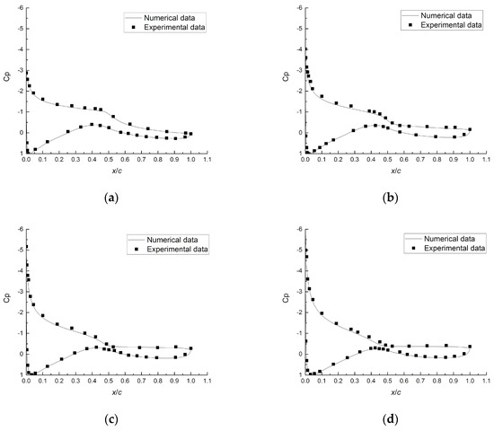 The computed pressure coefficient (Cp) distributions are compared with the experimental data [23] in Figure 4 for several angles of attack at Re = 1 × 106. As can be seen, they are in excellent agreement, which means that the separation points can be well predicted.