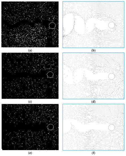 Particle dispersion pictures at three St numbers: (a) Experiment at St = 0.98; (b) computation at St = 0.98; (c) experiment at St = 6.5; (d) computation at St = 6.5; (e) experiment at St = 19.7; (f) computation at St = 19.7.