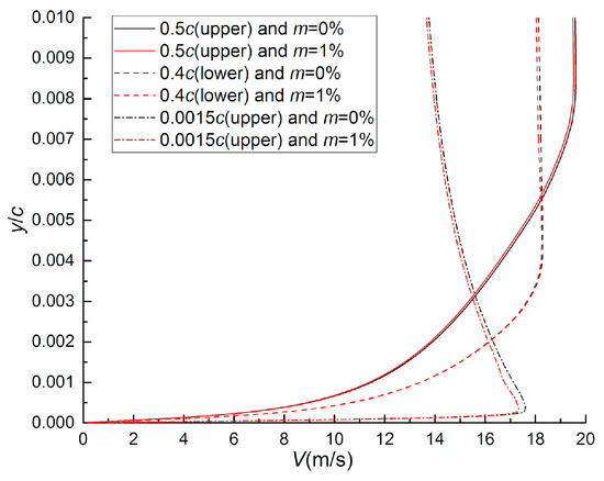 In Figure 6, the aerodynamic coefficient increments change slowly in the range of small angles of attack without flow separation. In an attached flow, the airfoil aerodynamic performance is affected by the boundary layer momentum loss due to particles. Figure 7 illustrates the velocity profiles at three positions on the S809 airfoil surface with relatively large curvatures, where the legends of upper and lower refer to the upper and lower surfaces, respectively. The particle phase makes the velocity in the boundary layer decrease, and the influence near the leading edge is greater.