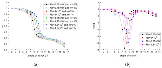 Figure 11 gives the moving distance of separation point at three particle concentrations and Re = 1 × 106. Likewise, a larger particle concentration causes a larger moving distance. The maximum upstream-moving distance increases from 5% at m = 0.5% to 17.2% at m = 2%. For three particle concentrations, the angle of attack corresponding to the maximum moving distance also equals a constant value of 8.1°, which is 1° smaller than the most sensitive angle of attack of 9.1°. So, this angle difference is not influenced by the particle concentration, which has been verified to be independent of Re number in Section 4.1.
