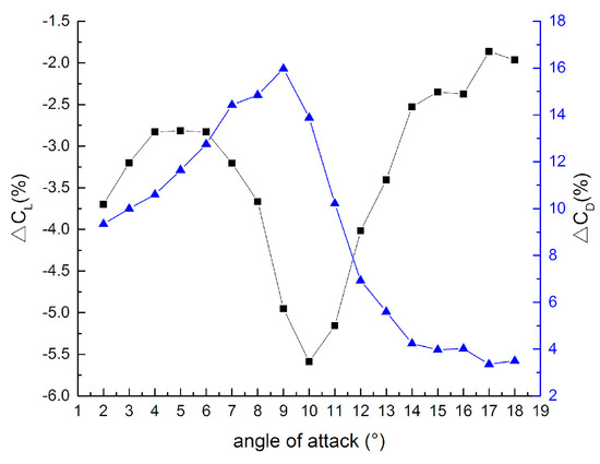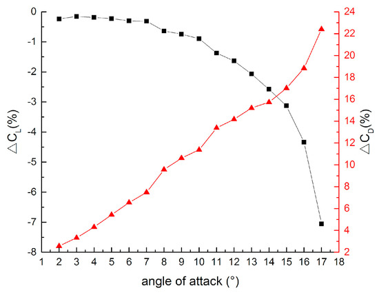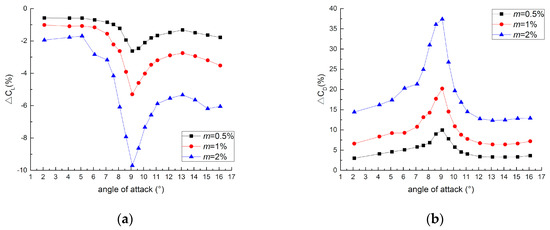 The particle concentration m is related to a specific environment. It may be less than 0.5% and more than 2% under the sandstorm and rain conditions, respectively. In this subsection, three particle concentrations of 0.5%, 1% and 2% are considered at Re = 1 × 106. As displayed in Figure 9, a higher concentration leads to a greater influence. The maximum lift and drag coefficient increments are respectively −2.6% and 10% at m = 0.5%, and they are −9.7% and 37.4% at m = 2%. The most sensitive angle of attack maintains a fixed value of 9.1° for three particle concentrations, which means that the particle concentration does not affect the most sensitive angle of attack.