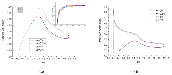 Pressure coefficient distributions over two airfoils at Re = 1 × 106 and m = 0%: (a) NH6MW25 airfoil; (b) S809 airfoil.