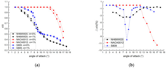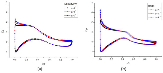 Figure 17 compares the location and moving distance of separation point between three airfoils. Likewise, due to the light stall phenomenon, a maximum moving distance can only be observed for the S809 and NH6MW25 airfoils. In Figure 15 and Figure 17b, there is still an angle difference between the maximum increments of aerodynamic coefficients and the maximum moving distance of separation point for the NH6MW25 airfoil. Figure 18 displays the pressure distributions over the S809 and NH6MW25 airfoils at Re = 1 × 106 and m = 0%. Due to the difference in the position of the highest point on the upper airfoil surface as well as the curvature difference between these two airfoils (see Figure 13), the adverse pressure gradient in the vicinity of the highest point on the upper surface of the S809 airfoil in Figure 18 locates farther downstream and is stronger compared with the NH6MW25 airfoil. So, in Figure 17a, the separation point on the S809 airfoil moves upstream much faster while the angle of attack approaches the angle for maximum lift, and the curves for these two airfoils intersect.