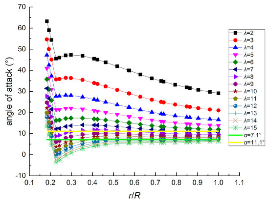 The more sensitive tip speed ratios can be then predicted from the more sensitive angles of attack by using Equation (10). Figure 19 shows the angles of attack of the Phase VI blade sections at different tip speed ratios and a zero pitch angle. In Section 4, the more sensitive range of angles of attack of the S809 airfoil has been determined as from 7.1° to 11.1°. Subsequently, it can be analyzed from Figure 19 that the more sensitive region of tip speed ratios of Phase VI is from 7 to 12.