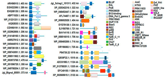 Schematic representation of the different blue light using flavin (BLUF) modular domain containing proteins. The accession numbers were taken from National Center for Biotechnology Information (NCBI). The mentioned “AA” indicates the amino acid numbers of the particular BLUF modular protein.