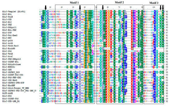 The analysis of 34 BLUF sequences revealed that residues forming BLUF catalytic core are conserved throughout for interaction with the flavin chromophore (Figure 2). The amino acids tyrosine (Y), asparagine (N), glutamine (Q), and tryptophan (W) or methionine (M), which are crucial for the photodynamics and photocycle of the BLUF domain, are highly conserved (Figure 2). Our analysis further confirms that tyrosine, glutamine, and tryptophan (or methionine) are critical for the substrate specificity of the BLUF sequences, as has been reported earlier [6,11,33,57]. The photo-activation of the BLUF domains actually involves conserved glutamine and tyrosine residues, where glutamine contributes to hydrogen bond formation in a dark state [11,12,13,14]. However, in light adapted conditions, a hydrogen bond rearrangement (tautomerization) occurs to form a new hydrogen bond with tyrosine [11]. A motif analysis revealed three different conserved motifs (Figure 2) among different BLUF sequences. Each motif has its importance, as each of them was comprised of an essential amino acid residue involved in the regulation of the BLUF photocycle and photodynamics [6,11].