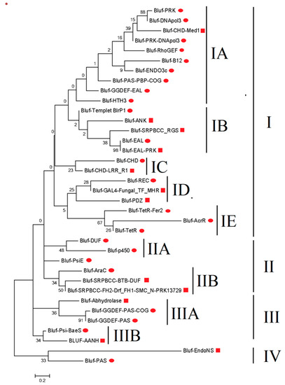 The phylogenetic analysis of the selected sequences of 34 BLUF domains divides them into four distinct clusters (I–IV), which seem to differ from each other mainly by the presence of eukaryotic and prokaryotic BLUF proteins in them (Figure 3). As observed from the phylogenetic analysis, the BLUF domain sequences of eukaryotic and prokaryotic origins are evolutionarily intermixed. Each cluster (except cluster IV) was further subdivided into sub-clusters, which represent closely related BLUF domain sequences broadly associated with similarkind of effector domains (Figure 2).
