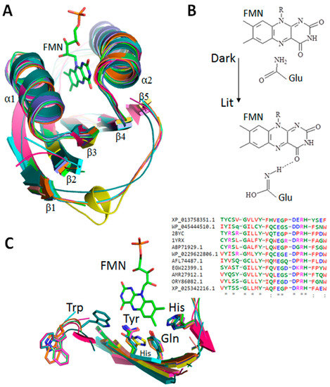 - Stephan, E.; Granzin, J.; Circolone, F.; Stadler, A.; Krauss, U.; Drepper, T.; Svensson, V.; Knieps-Grünhagen, E.; Wirtz, A.; Cousin, A.; et al. Structure and function of a short LOV protein from the marine phototrophic bacterium Dinoroseobactershibae. BMC Microbiol. 2015, 15, 30. [Google Scholar]