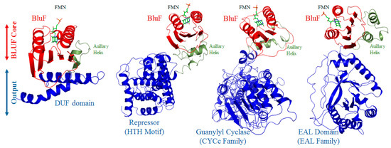 The occurrence of the BLUF domain in different associations reveals the diversity and abundance of this modular domain in a wide range of organisms. Our sequence and fold analyses confirm various types of effector domains fused with the BLUF domains (Figure 5).