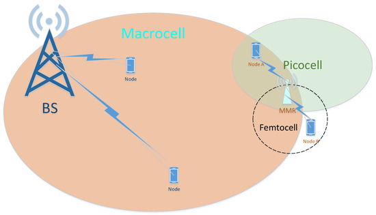 As is shown in Figure 1, heterogeneous hierarchical wireless networks (HHWN) introduces a lot of low-power base stations, such as picocells, femtocells, and distributed antenna systems (remote radio heads, such as relays). These heterogeneous elements can not only increase the flexibility of the network, but also fulfill huge user requirements for random complex data traffic, and raise its quality of service.
