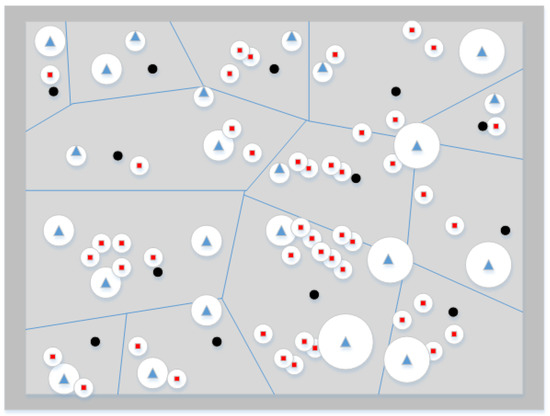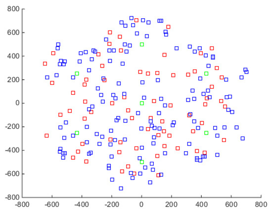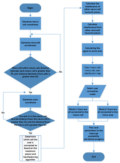 In Section 4, we verify above theoretical analysis by data simulation. The simulation diagram and parameters are shown in Figure 4 and Table 1. The hierarchical heterogeneous network model is shown in Figure 5, where the green squares represent macro cells, the red squares represent randomly distributed micro cells, and the blue squares represent users. The network also provides two user connection modes: (a) Both users access a random macro cell; (b) Both users access a random micro cell. It is possible to simulate the access mode of two users and perform system performance studies in the selected mode.