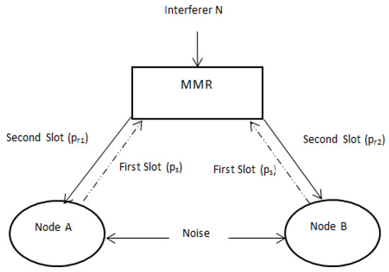 Note that in [17], it is complex for MMR to identify between source signals and interferences. Consequently, the MMR normalizes the received signals and relays them, then the two sources A and B receive signals, which are expressed by Equations (6) and (7).