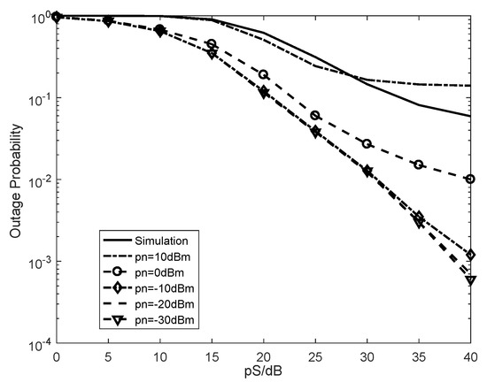 Figure 9 displays the performance of system outage probability, which is plotted by using Equation (29) in the circumstance with different noise power: , respectively. We can observe that the power level of noise significantly affects the system performance. Notice that when , the simulation results are approximate with the theoretical value before reaches 28 dB. One interesting point is that with the increase of , the system performance grows better than the theoretical analysis to a certain extent.