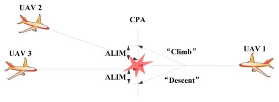Most of the CA systems use the upward or downward strategy to avoid collision. The sense selection can reduce the domino effect. For instance, two new encounters will occur if the key UAV descends, and three will occur if it climbs. The implementation of airborne CA systems II (ACAS II) [] indicates that it is effective and safe to perform resolution in the vertical direction; therefore, the method of this paper only considered the vertical change in direction. As shown in Figure 3, the key node direction choosing method was as follows.