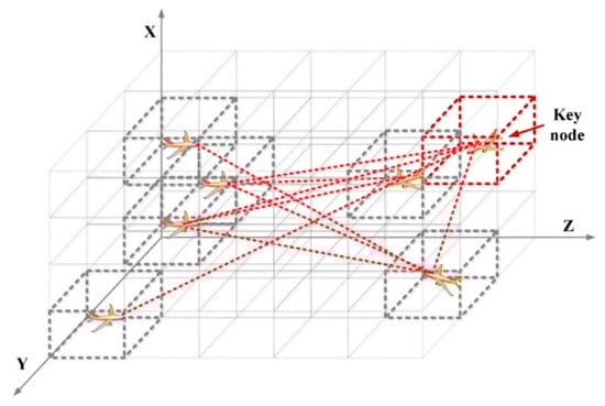 where is the relative speed of the vector direction, and represent the distance between the UAVs. This implies that the faster the two UAVs approach each other, the greater is the weight of the edge between the two UAVs. The degree of importance of each node can be based on the weight of all edges. The summed value represents the degree of importance of the node.