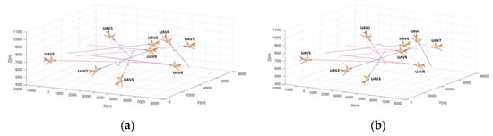 We conducted two different simulation experiments on nine UAV scenarios for two different key node selection methods. The cruise speed set by the UAVs was 10 m/s. The minimum separation distance was set to 35 m. The simulation step size was set to 1 s. The pitch angle ranged from −0.785 to 0.785. It was assumed that each UAV can sense the global information and, as such, simulation calculation time can be ignored. The emulation code was run on a T450 laptop(Lenovo Thinkpad T450 Laptop, Lenovo, Beijing, China) with an Intel i7 processor of 2.6 GHz and 8 GB of RAM.