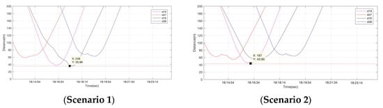 From this simulation, the results indicate that the CA system can facilitate the UAV cluster to effectively avoid collision in both scenarios. The figure illustrates the relative distance of each pair of UAVs that are involved in a collision scenario involving nine UAVs and four conflicts among them. It is noteworthy that the distance between and is defined by . Evidently, the separation of each pair of UAV is never intruded upon, according to Figure 5. For instance, in Scenario 1, encounters and , and the distances between them are always larger than the separation distance even at the closest point such that the safety flight is guaranteed, and it is the same in Scenario 2.