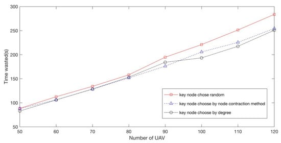 The simulation result presented herein clearly demonstrates the good performance of the CN algorithm for solving high-density CA problems, owing to the potential threat being solved preferentially and reducing the domino conflict. This shows that the wasted time increases if the number of UAVs increases, because more encounters will occur if more UAVs are cruising in the same limited airspace. This also shows the extra consuming time increases faster than the UAV density, and the difference between the extra consuming time under the CN algorithm and the extra consuming time under the random algorithm increases as the density of the UAV increases. However, while the key node is chosen randomly, the wasted time is always larger than that of the CN algorithm where the key node is chosen based on the degree or node contraction methods. Under the middle density circumstance (90 UAVs), the key node selection method by degree consumes more time than the key node selecting method by node contraction, because the node contraction method can obtain more potential threat information and can more accurately. choose the most threatened node The opposite applies for the high airspace density (more than 100 UAVs), because the airspace is sufficiently clouded such that the most intuitive method can more efficiently handle this type of situation.