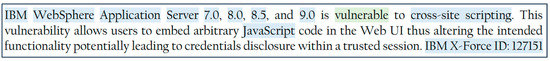 The two main tasks of information extraction are Named Entity Recognition (NER) and Relation Extraction (RE). NER can be generic where the aim is to extract general entities such as the names of places, people, etc., or can be specific to a domain. For instance, products, vendors, vulnerabilities are names of entities in the cybersecurity domain. Nowadays, the mainstream tools used for NER that give the best results rely on feature engineering to describe entities. These tools are usually domain specific, thus, depending on the features that characterize the entities in the domain. For instance, a sequence of entities in the financial domain are likely to be a company name, whereas in cybersecurity, they are more likely to be a software name. Figure 1 highlights some entities from the cybersecurity domain. The aim of relation extraction, on the other hand, is to extract knowledge about related entities from unstructured language sources such as text or speech and represent that knowledge usually as a triplet that has the form (subject, predicate, object). For instance, from the vulnerability description in Figure 1, we can extract the tuple (IBM, is_vendor_of, WebSphere), which is an instance of the relation type: (Software vendor, is_vendor_of, Software product).