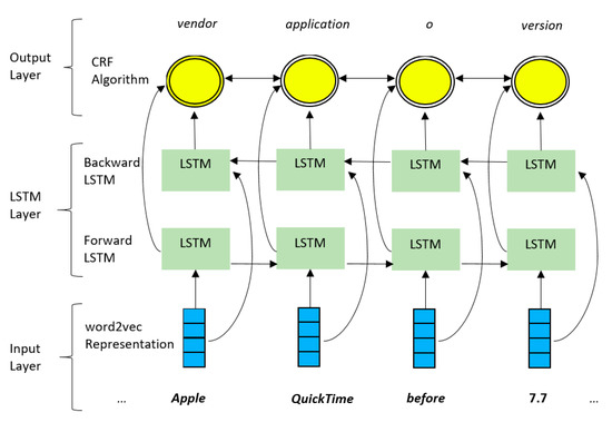 To evaluate the performance of LSTMs for the NER tasks, we applied the LSTM-CRF method introduced by Lample et al. [19] to the domain of cybersecurity vulnerability management. This architecture is a combination of LSTMs, CRFs, and word embeddings. Its input is an annotated corpus in a format similar to the format of the CoNLL-2000 dataset [20]. This dataset contains a list of words with a tag denoting the type of the word. There is no description of the features of entities, hence it is domain and entity agnostic. We compared the results we obtained with a notably fast and accurate CRFs implementation called CRFSuite [21]. Annotated corpus is not widely available in the cybersecurity domain as opposed to other domains such as the biomedical domain. To train the models, we used the annotated corpora provided by Bridges et al. [2].