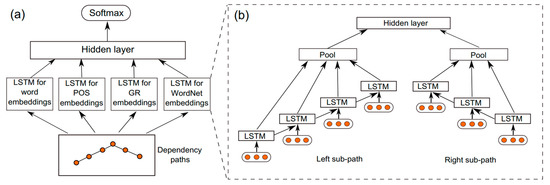 - Xu, Y.; Mou, L.; Li, G.; Chen, Y.; Peng, H.; Jin, Z. Classifying relations via long short term memory networks along shortest dependency paths. In Proceedings of the 2015 Conference on Empirical Methods in Natural Language Processing, Lisbon, Portugal, 17–21 September 2015; pp. 1785–1794. [Google Scholar]
