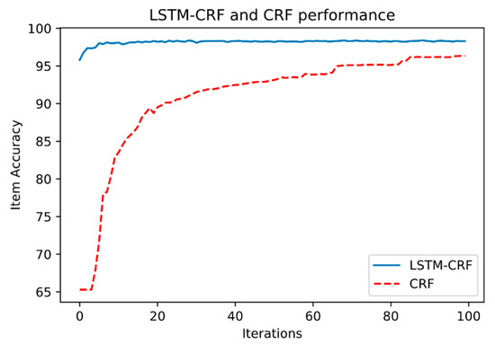 The global item accuracy of the two models is shown in Figure 6. It shows the trend of accuracy for the development set over the training of 100 epochs. As we can see, the LSTM-CRF model achieved an accuracy of 95.8% from the first epochs and continued to increase to reach a maximum of 98.3% at the 23rd epoch until the end of training. The CRF method on the other hand, started with a low accuracy of 65% but increased quickly over the training epochs to eventually reach an accuracy of 96% and stabilized to the end of the training with an accuracy of 96.35%.