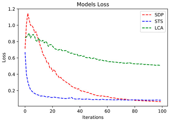 We trained the models for 100 epochs. Figure 7 shows the decrease of the loss for the three models during training. We can see that the STS and SDP models achieved the lowest loss at the end of the training while the LCA model ended the training with a relatively high loss.