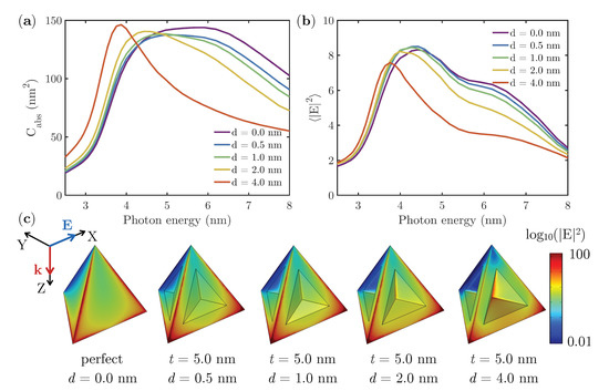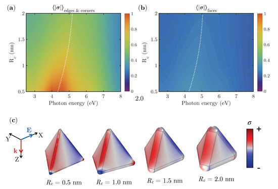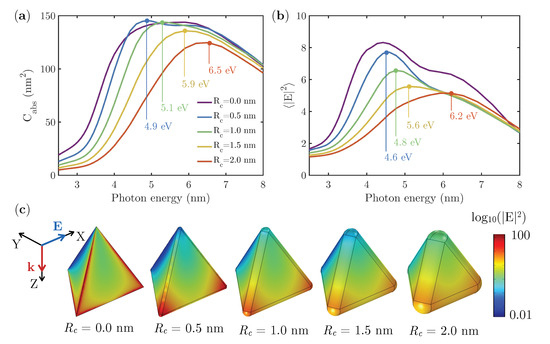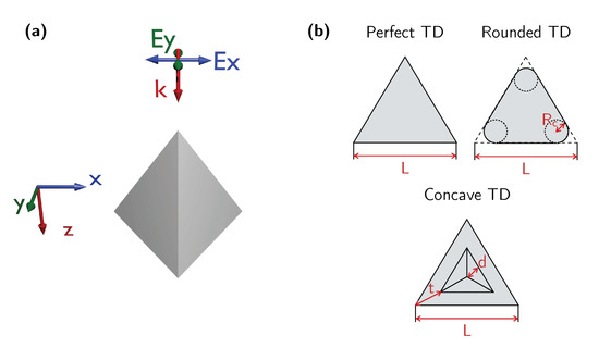 As shown in the previous section, the optical response strongly depends on the shape of the NP. Therefore, we now consider how the LSPR for an isolated perfectly shaped TD is modified when some deformations are introduced. Specifically, here, we will consider the effect of rounding the corners and edges of the TD. This type of deformation can arise during the chemical synthesis or from the extended use of the TDs as catalysts. Specifically, we have studied the effect of rounding the edges and corners by varying their curvature radius from 0 nm (perfect TD) to 2 nm. This study has been done starting from a perfect TD with side length nm illuminated under normal incidence with a monochromatic plane wave under and polarization (see Figure 1a).