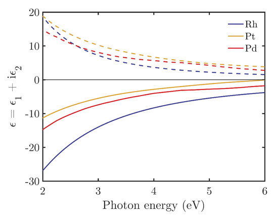 In this work, we have used the frequency dependent complex dielectric functions () of Rh, Pt and Pd taken from References [15,16,17]. The complex dielectric functions of these materials are plotted in Figure 2. The Fröhlich frequency () for these metals are 8.0 eV for Rh, 4.5 eV for Pt and 5.7 eV for Pd. At those energies, the figure of merit [18], typically used to evaluate the efficiency to generate LSPRs, and defined as , takes the following values: 2.25 for Rh, 0.35 for Pt and 0.66 for Pd. Therefore, Rh is able to support higher quality LSPRs reaching higher photon energies.