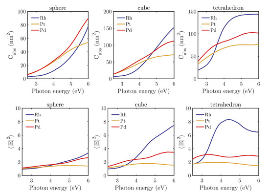 Figure 3 plots the absorption cross-section (top row) and spectral electric field intensity averaged () over the NP’s closed surface (bottom row) for equivalent spheres, cubes and tetrahedra made of Rh, Pt and Pd. It can be seen how the tetrahedron presents the LSPR at lower photon energies than the other two geometries. In fact, it shows a broad peak that covers from 3.5 to 6 eV. In general the values of and are the highest for Rh followed by Pd and Pt as expected by the values of : 2.25 for Rh, 0.35 for Pt and 0.66 for Pd. In addition, it can be observed how the shape has a strong influence on the LSPRs and their spectral position. The LSPRs in the tetrahedra are produced at lower energies than those of the nanocubes and spheres, the latter being those appearing at higher energies.