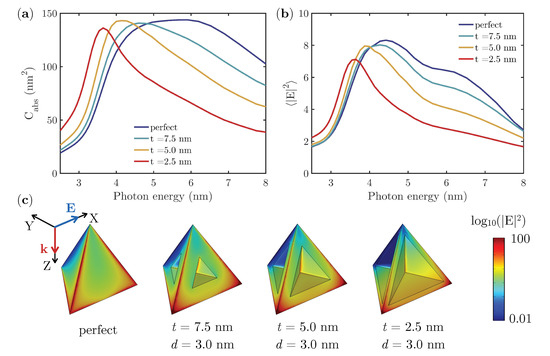 (a) Absorption cross-sections () of edge length L = 20 nm Rh TDs with a concavity with increasing size t while keeping its depth constant nm; (b) local field enhancement () averaged over the TD’s surface; (c) local field enhancement in logarithmic scale () over the surface of the different TD when illuminated with the corresponding resonant wavelength.