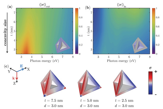 Recent studies have reported the possibility of synthesizing Rh TDs with concave faces with defect-rich surfaces [12,13]. These defects have been shown to enhance the photocatalytic energy conversion [13]. Therefore, in this section we will evaluate how the near-field enhancement and the charge density are distributed over the TD’s surface when concavities are introduced at their flat faces. In this way, we can look for the concavity parameters that maximize the surface and inside the cavity to enhance its catalytic properties, while keeping high values of these magnitudes at the outer edges and corners to maintain their inherent reactivity. In order to do this, we have varied the size of the concavity t and its depth d (see Figure 1b).