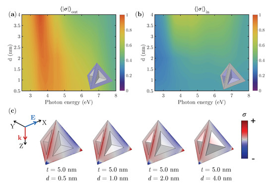 Attending to the normalized surface charge density averaged outside and inside the concavity ( and ), we have looked at the possibility of simultaneously maximizing both magnitudes in order to increase the reactivity in the external edges and corners as well as in the defect-rich inner surfaces of the concavity. Figure 9 shows the average of the absolute value of the surface charge density (a) outside and (b) inside the concavity. It is clear that, by deepening the concavity, the surface charge density inside and outside increases. Therefore, the deeper the concavity the higher are the values of and . The increasing value of with d can be rationalized in terms of the lightning rod effect—as d increases, the angle formed between the inner and inner-outer faces of the concavity decreases, producing a lightning-rod effect [24] at those regions that, consequently, lead to higher surface charge densities. All these effects can be seen in Figure 9c, which plots the surface charge distribution over the studied TDs when illuminated at resonance.