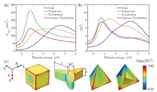 Figure 10 plots (a) and (b) for the aforementioned geometries: the cube, tripod star, tetrahedron and concave tetrahedron. The near-field distribution on their surfaces when illuminated at resonance is shown in Figure 10c.