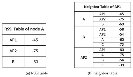 RSSI table. For example, node A maintains the average RSSI of AP1, AP2, and node B, as in
