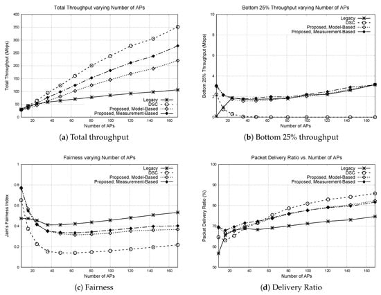 In the scenario, suppose when AP1 transmits a packet, the received signal strength at AP2 is −80 dBm. In the first case, AP1 sends a packet to A. Using the described model-based method, AP1 calculates as −75 dBm, and includes the information in the preamble of the packet. When AP2 receives the preamble, AP2 was waiting for the channel to send a packet to node C. calculated at AP2 is −60 dBm. Since is higher than −80 dBm, AP2 decides the channels is idle and continues counting down the backoff counter. If the counter reaches zero, AP2 transmits concurrently with the on-going transmission from AP1. In the second case, AP1 sends a packet to B. In this case, the is calculated as −85 dBm, because node B is distant from AP1. When AP2 receives the preamble from AP1, its CST becomes = −85 dBm, which is lower than −80 dBm. Thus, AP2 decides the channel is busy and defers transmission. In summary, the proposed scheme can control CST considering not only the senders but their destinations, to improve spatial reuse while avoiding hidden terminal effects.