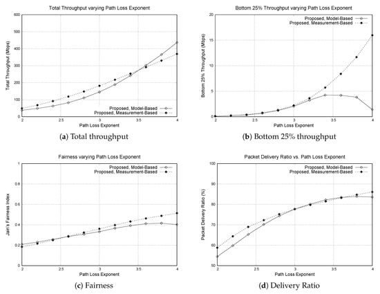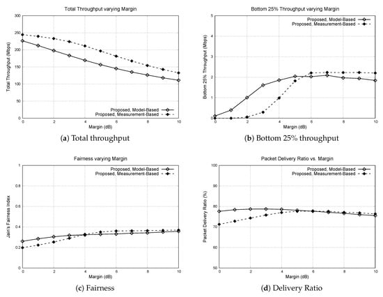 Please note that the margin parameter is also used in the measurement-based scheme. Although the scheme does not use a path loss model to calculate CST, margin is still needed because of channel variations, and possibility of multiple interferers. While the model-based scheme selects CST conservatively by assuming that an interferer exists in the worst position, the measurement-based scheme could choose a CST which makes the nodes transmit more aggressively. Because of that, a larger may be needed for measurement-based scheme to account for multiple interferers, compared to the model-based scheme. In the evaluations, we study the performance of protocols while varying the margin value.